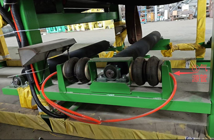 在正常運(yùn)轉(zhuǎn)中,濾布是不會碰到糾偏裝置的檢測桿。當(dāng)濾布跑偏時,濾布會碰到檢測桿,檢測桿偏移,自動糾偏裝置中的氣囊會一側(cè)充氣,一側(cè)放氣,帶動糾偏輥蛇形偏移,使濾布改變偏移方向,恢復(fù)到正常運(yùn)轉(zhuǎn)軌跡。