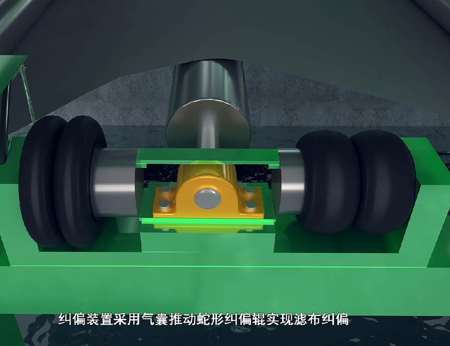 濾布在運(yùn)轉(zhuǎn)過程中可能會出現(xiàn)跑偏的現(xiàn)象,利用濾布糾偏裝置糾正濾布偏移方向,使濾布處于正常工作狀態(tài)。