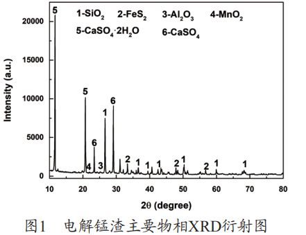 電解錳渣為粉末狀固體廢棄物,其為黑色細小顆粒,水分含量較多,平均含水量在30% 左右。本文對所選貴州地區(qū)電解錳渣中化學成分進行分析測試,發(fā)現其主要元素組成為 O、P、K、Ca、Mg、S、Si、Mn、Fe、Na、Al 等,元素分析見表1。電解錳渣化學組成及含量見表2。圖1為所選電解錳渣 XRD 檢測結果,得出該電解錳渣的主要成分,含有的主要物相為石英(SiO2)、黃鐵礦(FeS2)、硫酸鈣(CaSO4)、生石膏(CaSO4· 2H2O)、氧化鋁以及氧化錳等。